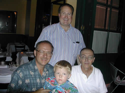 | I was able to have dinner with Dan Parietti pkt 67 and an old room mate Karl Krummel pkt 70 while my family vacationed in New York City last weekend. From left: Dave, son Douglas, Dan seated and Karl standing | |